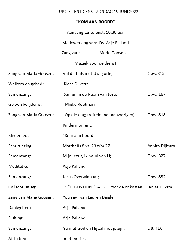 Zondag 19 juni 2022 om 09:30Kerkdienst tentdienstVoorganger(s): verzorgd door commissie Organist: geen organist nodig | Oppasdienst: geen |